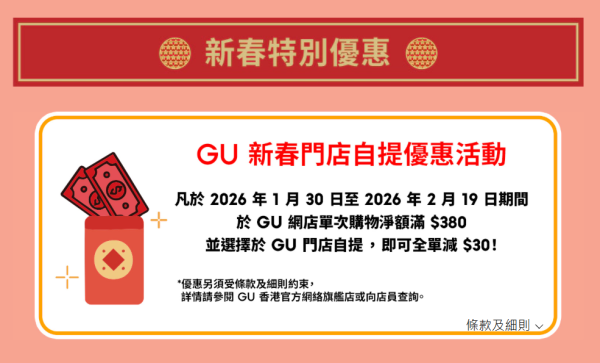 由即日起至2月19日期間,於GU網店單次購物淨額滿$380並選擇於 GU門店自提,即可全單減$30!