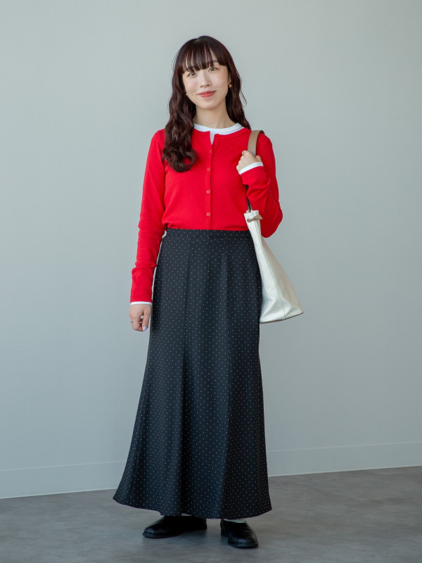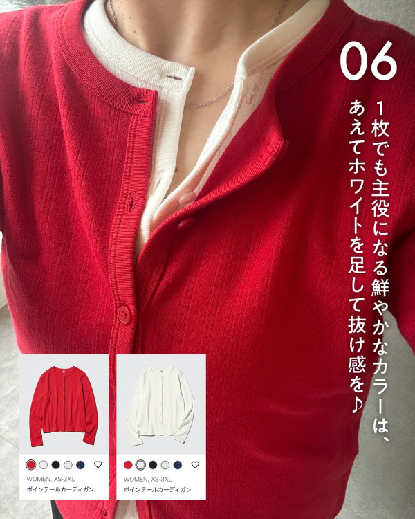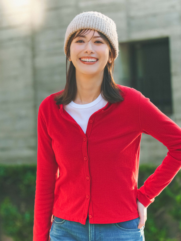 鮮豔的紅色是提升氣色的好幫手!選擇一件有復古感的透孔針織外套,內搭選擇乾淨的白色。紅色雖然搶眼,但加入白色內搭可以起到「留白」的作用,中和視覺衝擊,讓紅色穿搭看起來更清爽、更減齡,不會顯得老氣。
