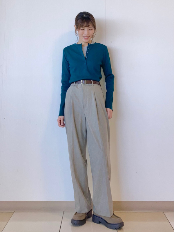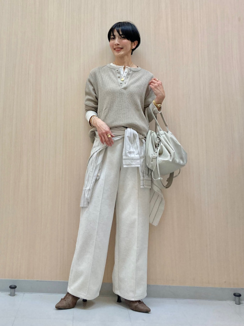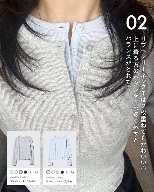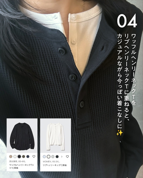 覺得單穿一件亨利領(Henley Neck)T 恤太單調?日本女生教你「兩件疊穿」!外層穿灰色,內層搭淺藍色。重點在於「鈕扣的開合」。外層的 T 恤要比內層「多解開一顆鈕扣」,這樣能營造出豐富的領口層次,既保暖又充滿日系休閒感。