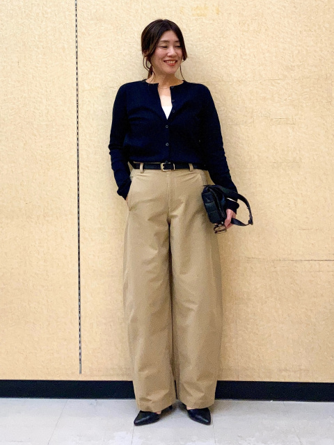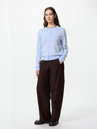 這招絕對是 OL 必學!將基本款的圓領針織外套當作上衣穿著時,不要全部扣上,試著解開領口的幾顆鈕扣,並在裡面搭配一件對比色系(如深啡色配粉藍色)的圓領內搭。解開鈕扣能人為製造出「V領」效果,修飾臉型,露出內搭顏色更能展現「隨性的時尚感」。