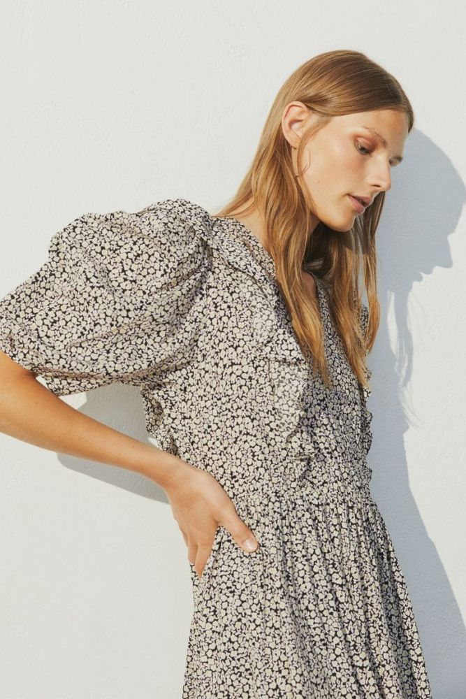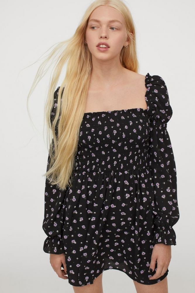 碎花連身裙帶有縮褶小細節,若嫌花朵圖案太花巧的話,淺紫色都是不錯的選擇。色調柔和,肩部飾有小荷葉邊和公主袖,即使是小短裙,長袖看起來亦不會過於性感。