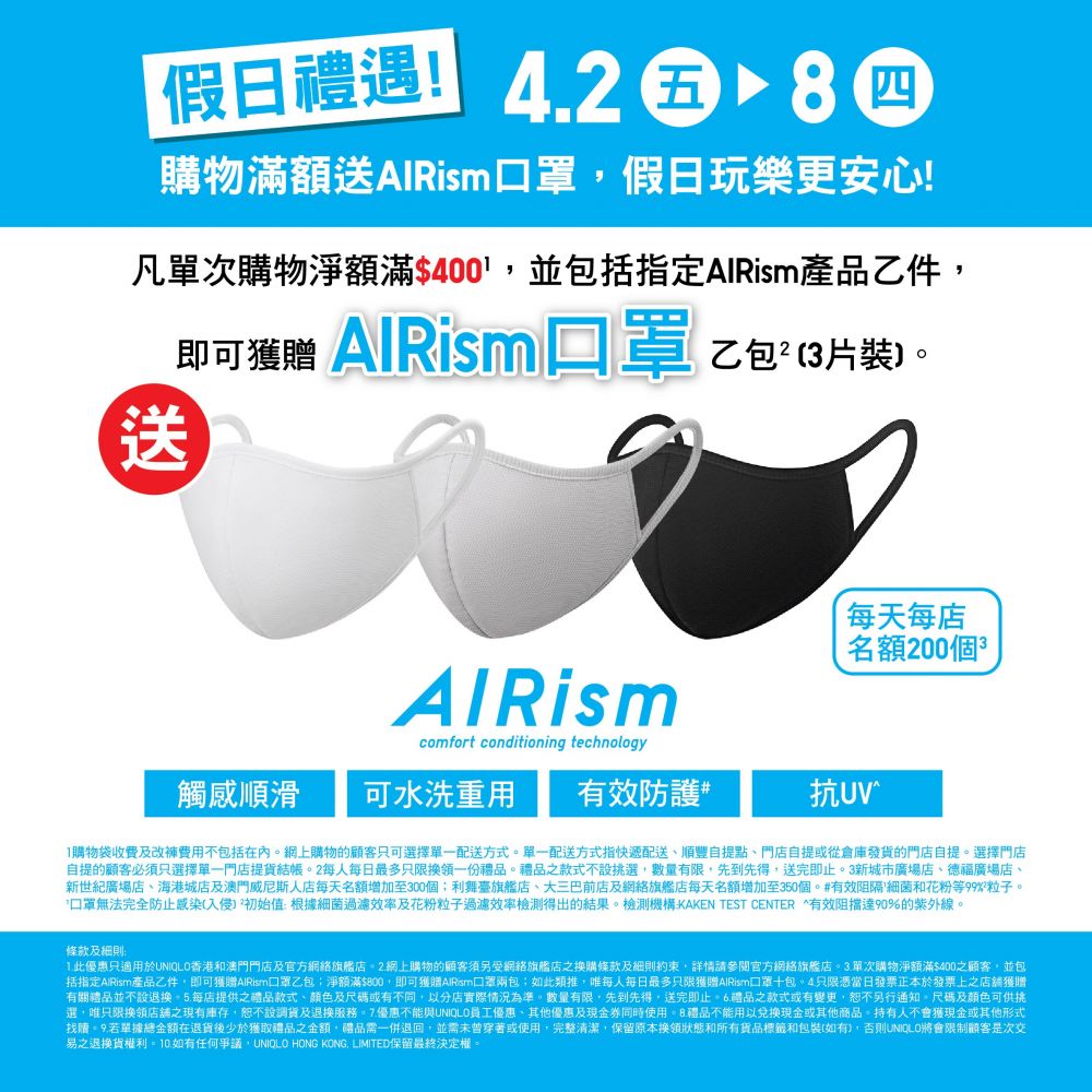 除了優惠價格和新系列外,4月2日至8日期間,凡單次購物滿$400,並包括指定AIRism 產品乙件,即可獲贈AIRism 口罩乙包 (3 片裝)