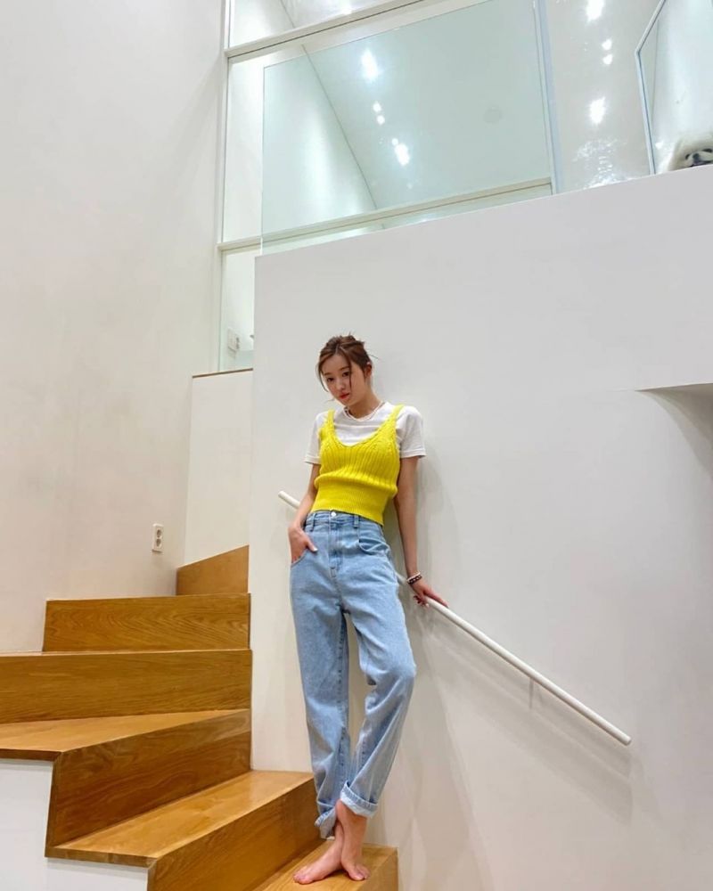 不喜歡穿褲子但又想顯高的女生,不妨嘗試一下高腰半截裙吧!YooA不時亦會穿著各款半截裙,大部分都是以高腰為主,能拉高腰線外,更可以露出腿部,打造長腿和增高的感覺。