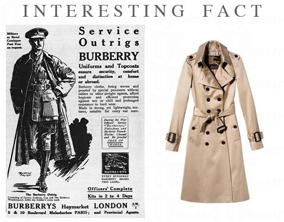 Burberry的風衣 - 深受現代的時裝精喜愛 - 其實起初是為士兵發明的。在第一次世界大戰中,士兵們會把Burberry風衣穿著他們的制服外面,並在這些風衣的肩帶上掛上手榴彈。Burberry trench coat是直到戰爭結束後才開始平民化的。